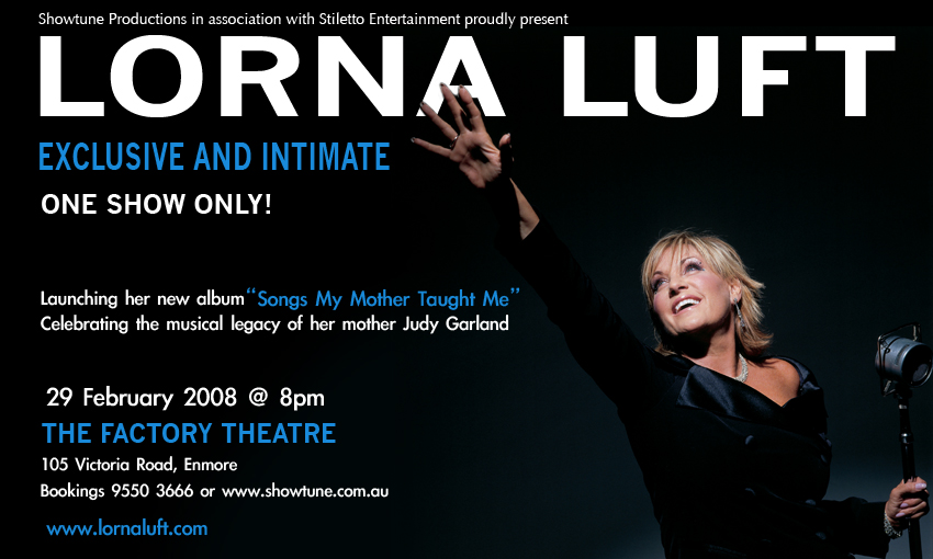 To start the year we are running a promotional tour for the release of LORNA LUFT'S new album "Songs My Mother Taught Me" The music of Judy Garland. Lorna has agreed to do one exclusive and intimate performance at The Factory Theatre for us on the 29 February. This is a not to be miss event, Luft is a powerhouse in the great tradition, her new album produced by Barry Manilow is a wonderful celebration of her mums music. It is very exciting to be working with Lorna at long last, I have followed her career for many years. Judy Garland and her legacy has been probably the most influential creative inspiration for me, and I know many others in the entertainment world share this appreciation, it is an honour to help Lorna spread the word on the incredible legacy Garland left us all.